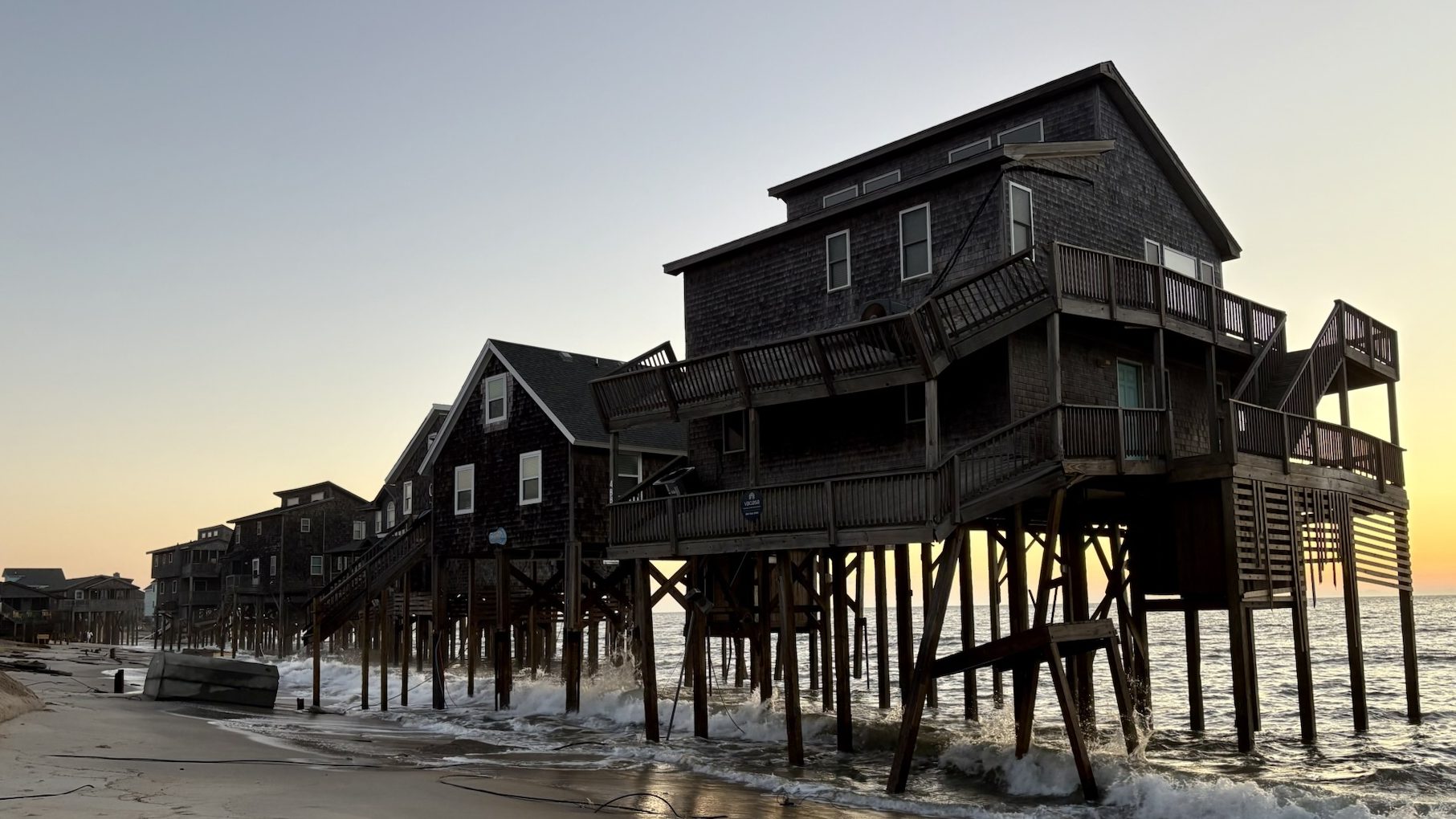 Cape Hatteras National Seashore (CHNS) reported that the unoccupied houses fell between 2 and 2:45 p.m. along Cottage Avenue and Tower Circle Road. No injuries were reported, but officials closed the beachfront from northern Buxton through off-road vehicle (ORV) ramp 43 for public safety. Visitors are urged to avoid the area, as debris is scattered for miles along the shoreline and further collapses remain possible.